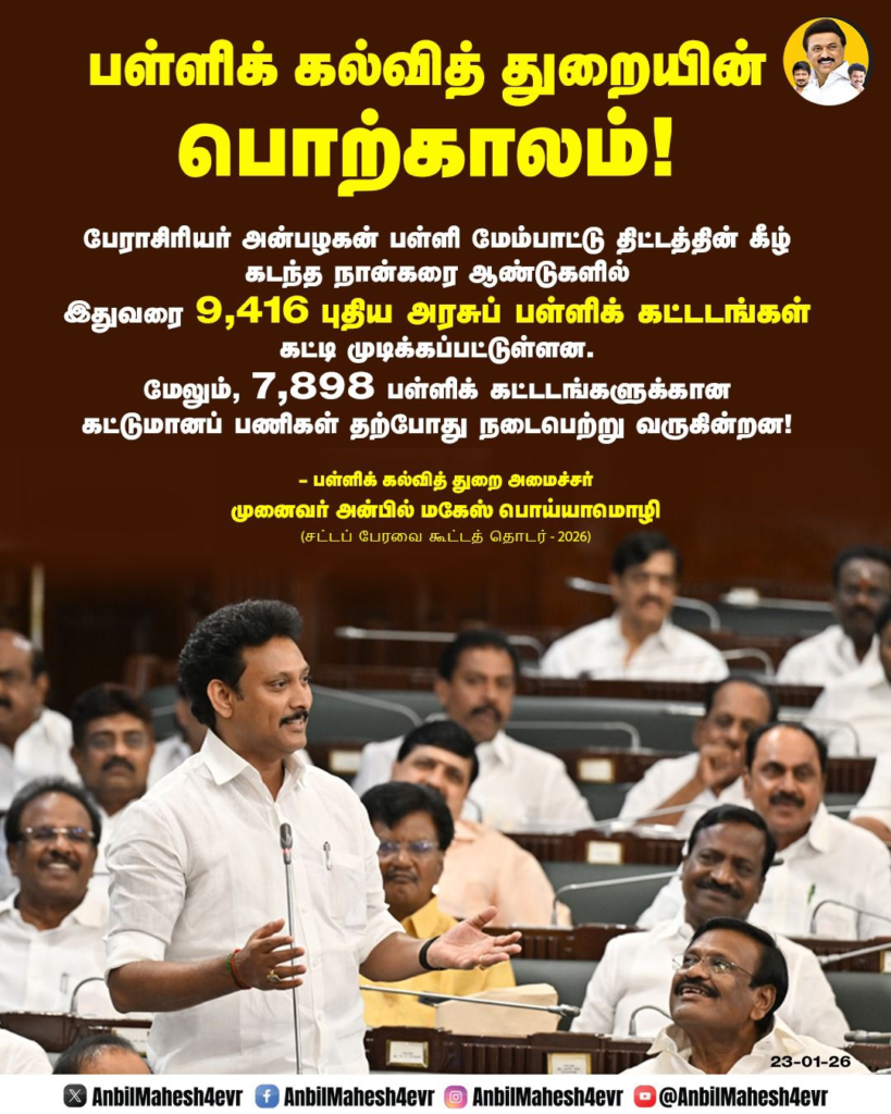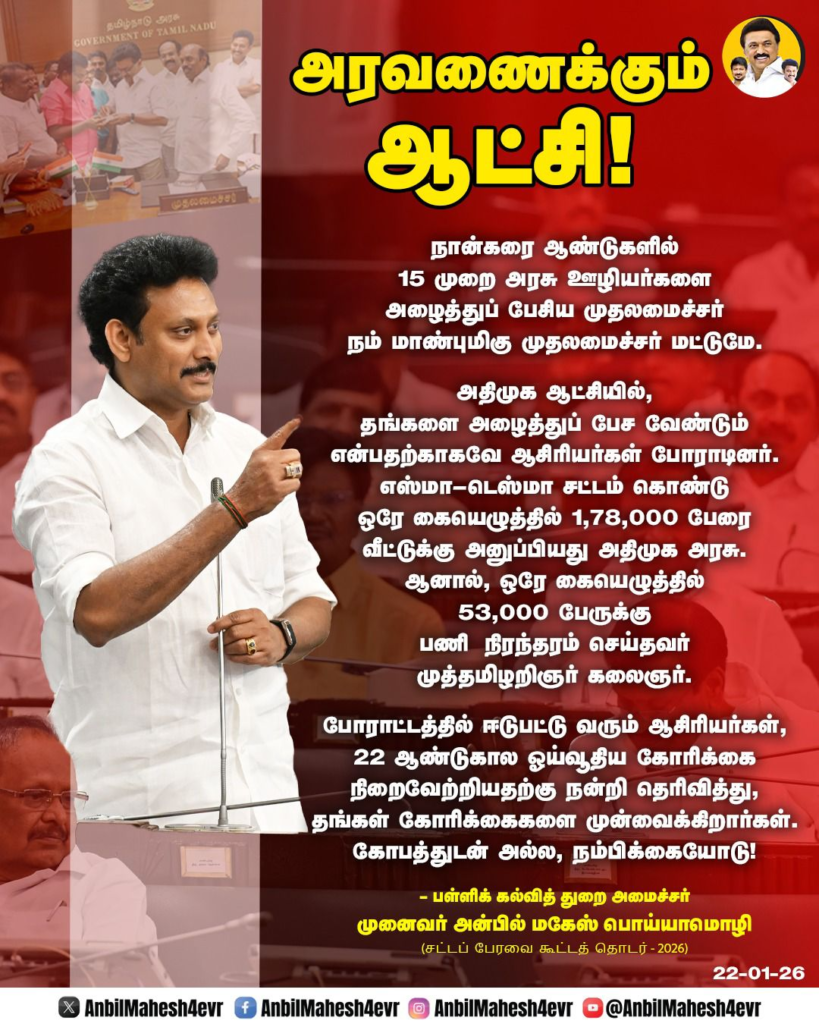 2026 ஜனவரி 20 முதல் 24 வரை நடைபெற்ற தமிழ்நாடு சட்டமன்றக் கூட்டத் தொடரின் முக்கிய நிகழ்வாக, மூன்றாவது நாளான ஜனவரி 22, 2026 அன்று ஆளுநர் உரை மீதான விவாதம் நடைபெற்றது. இந்த விவாதத்தில், அரசுப் பணியாளர்கள் மற்றும் ஆசிரியர்களின் கோரிக்கைகள் குறித்து விரிவாகவும் தெளிவாகவும் விளக்கமளித்தார் பள்ளிக் கல்வித் துறை அமைச்சர், முனைவர் அன்பில் மகேஸ் பொய்யாமொழி அவர்கள்.ஆசிரியர்களின் குறைகளைத் தீர்க்க, மாண்புமிகு தமிழ்நாடு முதலமைச்சர் மு.க. ஸ்டாலின் அவர்கள் இதுவரை 15 சுற்றுப் பேச்சுவார்த்தைகள் நடத்தி உள்ளதாக அமைச்சர் குறிப்பிட்டார். ஆசிரியர் மற்றும் அரசு ஊழியர்களின் கோரிக்கைகளை ஆய்வு செய்து, உரிய தீர்வு காண தமிழ்நாடு அரசு முழுமையாகத் தயாராக உள்ளது என்பதையும் அவர் உறுதிப்படுத்தினார்.