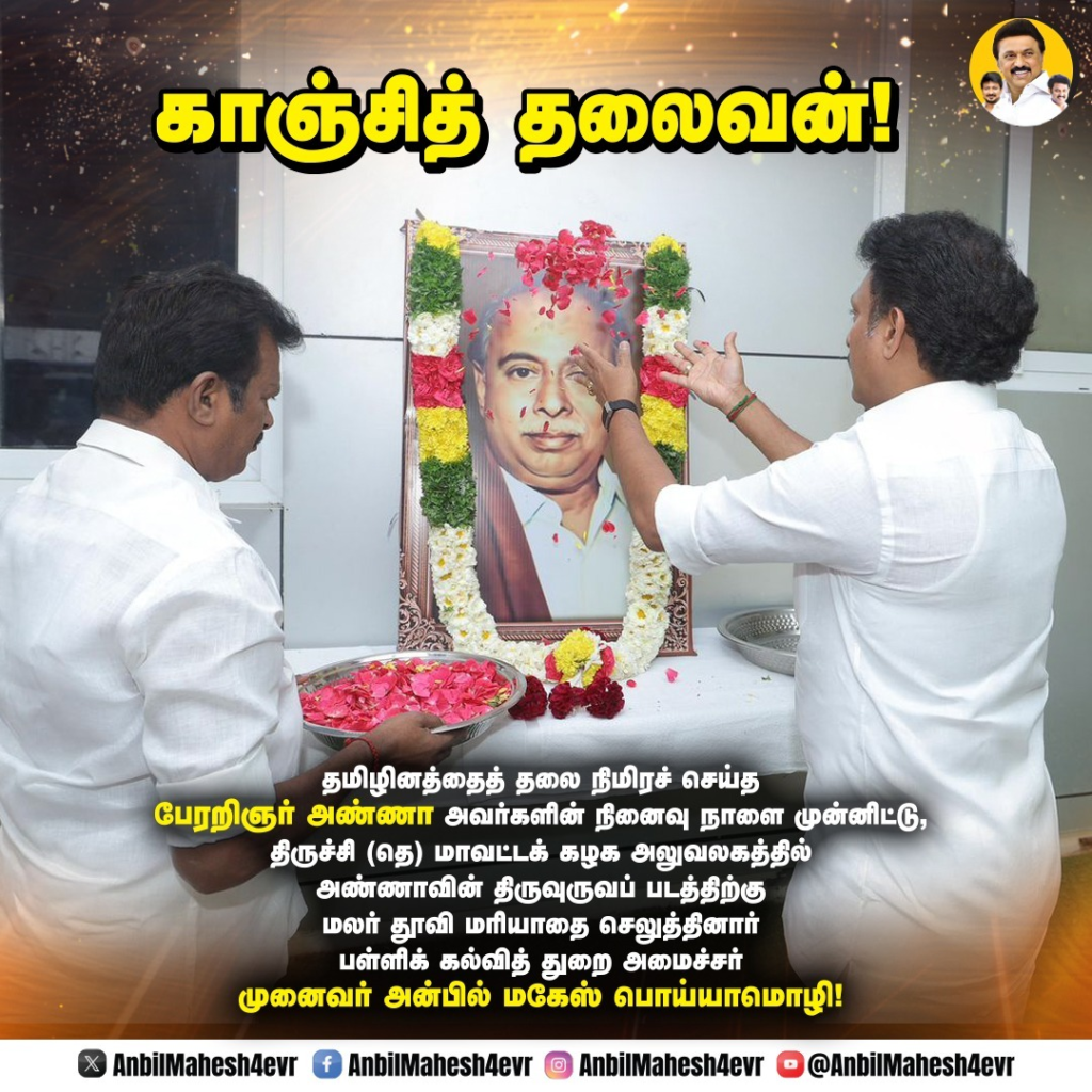 அவர் அமைத்த அடித்தளத்தின் பேரில்தான் தமிழ்நாடு இன்று தலைநிமிர்ந்து போராடி வருவதாக அமைச்சர் அன்பில் மகேஸ் பொய்யாமொழி அவர்கள் தெரிவித்தார். மேலும், கழகத் தலைவர் மற்றும் மாண்புமிகு தமிழ்நாடு முதலமைச்சர் திரு. மு.க. ஸ்டாலின் அவர்களின் தலைமையில் Dravidian Model ஆட்சி மீண்டும் அமைய, பேரறிஞர் அண்ணாவின் நினைவு நாளில் உறுதியேற்றார்.